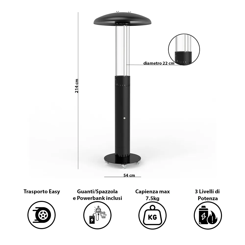 Aporta el máximo confort a tu hogar, incluso en espacios exteriores, con el calefactor eléctrico por infrarrojos en forma de seta SATURNO. Perfecto para calentar jardines, terrazas o porches, este calefactor está diseñado para proporcionar calor de forma inmediata y eficaz, sin humos ni emisiones de gas. Su elegante diseño con estructura metálica negra combina perfectamente con cualquier decoración de exterior, mientras que su amplia base garantiza la estabilidad incluso en condiciones de viento moderado. Equipado con una avanzada tecnología de infrarrojos, este calefactor eléctrico calienta rápidamente a las personas y objetos cercanos, manteniendo un ambiente cálido y acogedor incluso en las noches más frías. Fácil de usar, este calefactor cuenta con un intuitivo sistema de encendido mediante dos botones y no necesita mantenimiento, por lo que es ideal tanto para uso doméstico como profesional. Tanto si organizas una cena al aire libre como si simplemente te relajas bajo las estrellas, el calefactor de setas SATURNO garantiza una distribución uniforme del calor para lograr el máximo bienestar.